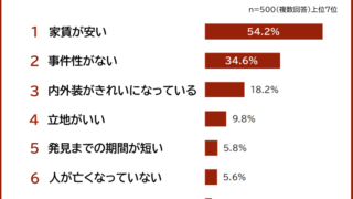 アンケート調査【住んでみたい&住みたくない事故物件ランキング】男女500人アンケート調査 あなたは「事故物件」でも条件がいいなら住んでみたいと思いますか。「住んでもいい事故物件」と「どうしても無理な事故物件」があるという人も多いかもしれません。全国の男女500人を対象に「住んでみたい事故物件」と「絶対に住みたくない事故物件」についてアンケートを実施しました。アンケート調査